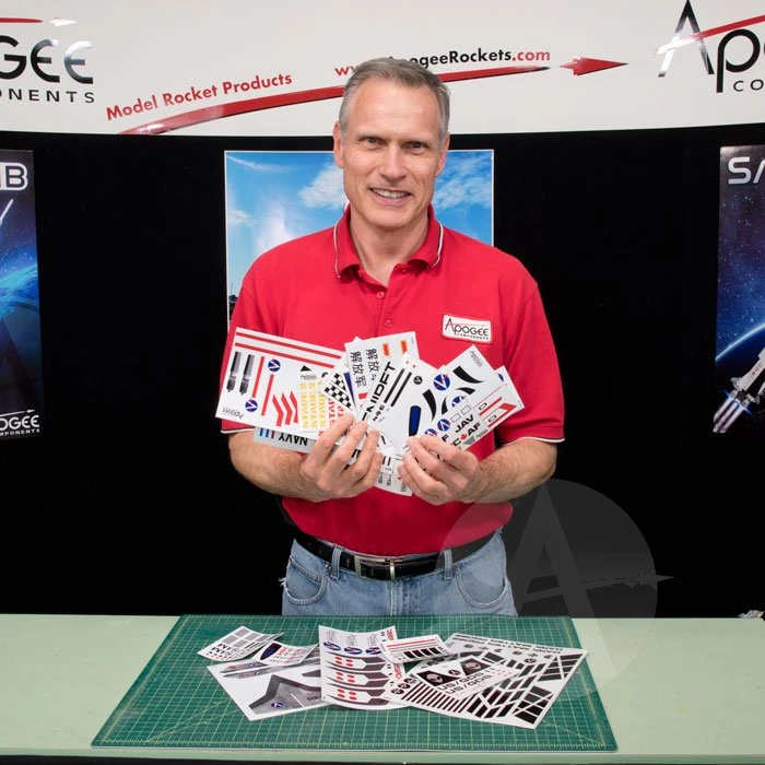 Here are the decals for the 25 rockets that appear in the Newsletter Plans booklet. They are printed on self-adhesive vinyl for easy application.
